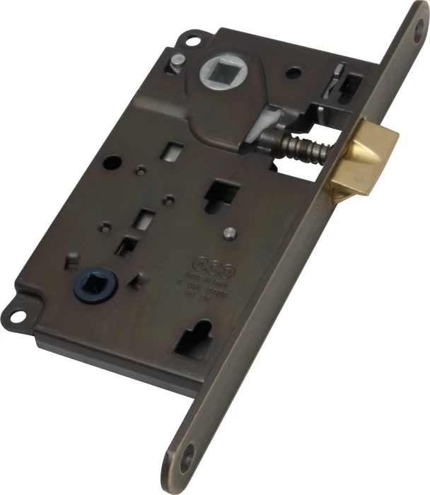 Замок межкомнатный сантехнический B01013.50.12 с защелкой WC серии Centro. 1защёлка в вверху. Ширина планки 18 мм. Расстояние от планки до центра цилиндра 50 мм. Межосевое расстояние 90 мм. Цвет: античная бронза.