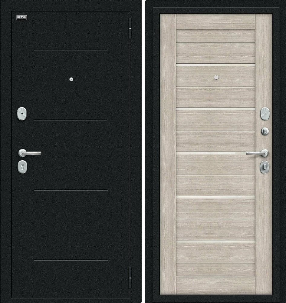Надежная входная Браво Техно Kale Букле черное/Cappuccino Veralinga премиум класса по цене 34 009 руб. Большая толщина стали защитит от проникновения в ваш дом, квартиру или коттедж. Используется очень качественная фурнитура: замки, цилиндры, ручки, защелки. Покрытие и отделка двери изготовлено под внимательным контролем производителя. Дверь имеет долгий срок службы и гарантию.