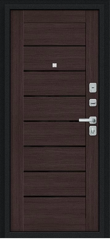 Надежная входная Дверь Браво Техно/BChrome Букле черное/Wenge Melinga премиум класса по цене 34 759 руб. Большая толщина стали защитит от проникновения в ваш дом, квартиру или коттедж. Используется очень качественная фурнитура: замки, цилиндры, ручки, защелки. Покрытие и отделка двери изготовлено под внимательным контролем производителя. Дверь имеет долгий срок службы и гарантию.